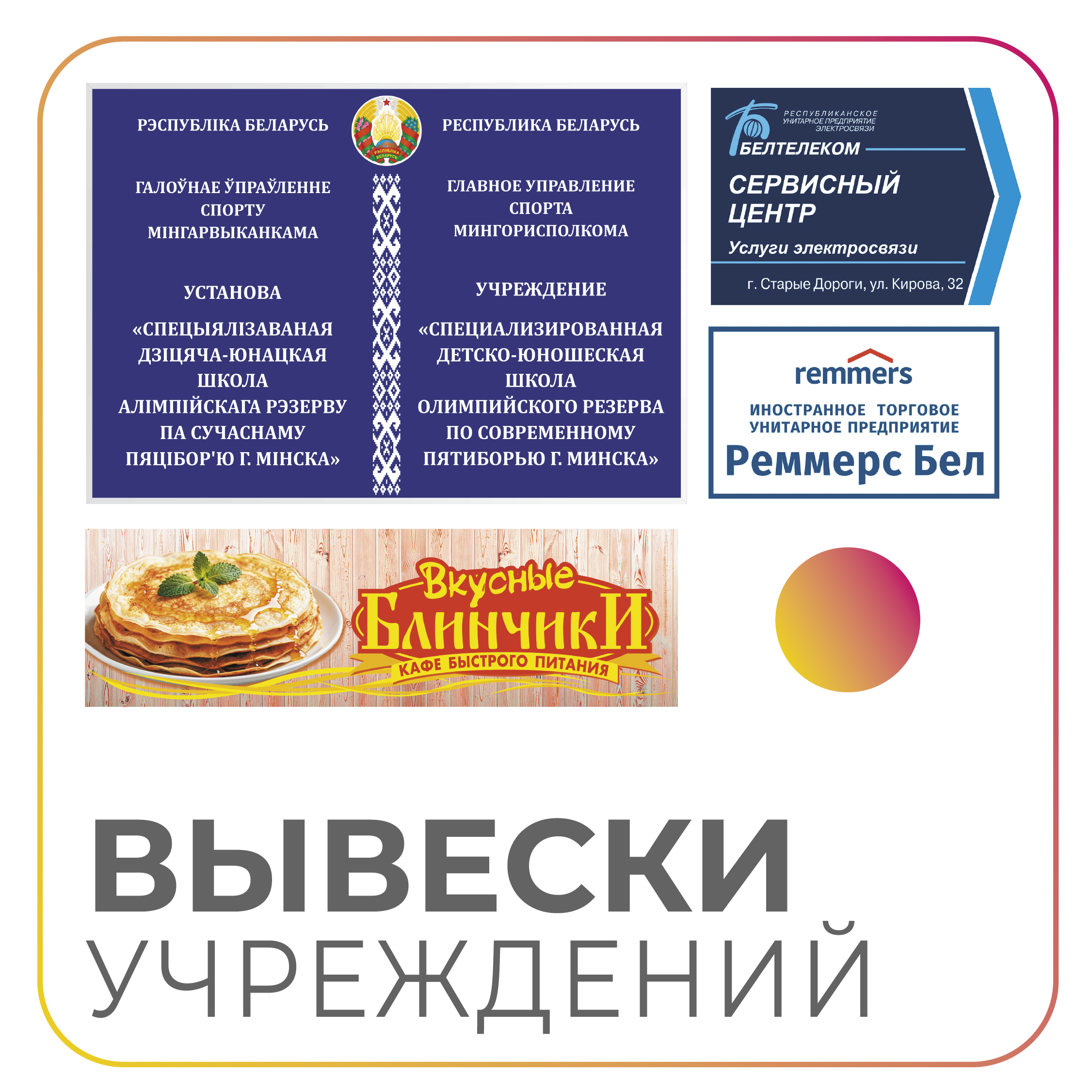 Работаем с клиентами по всей стране: организуем доставку по регионам в кратчайшие сроки. Всегда рады видеть вас клиентом нашей компании, ведь наш офис в центре Минска позволяет быстро решить вопросы по макетам и образцам лично. Поможем выбрать дизайн, согласуем цвет и размер, чтобы табличка стала полезным элементом интерьера.
